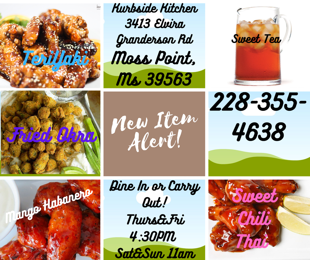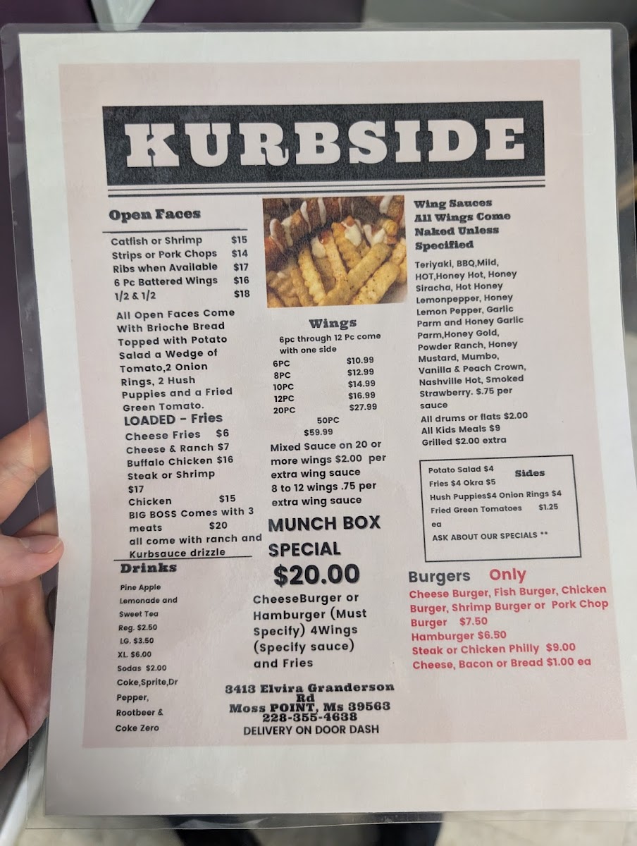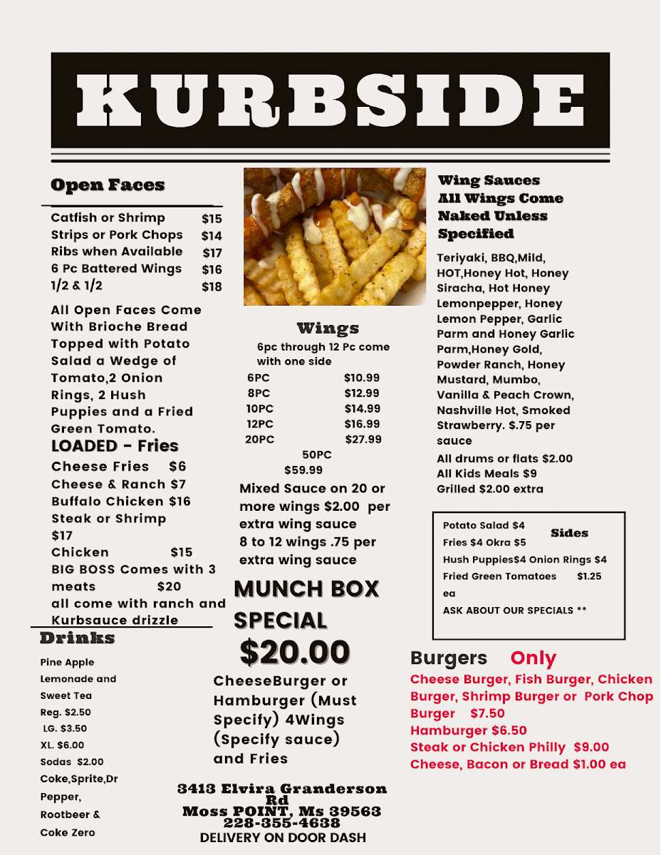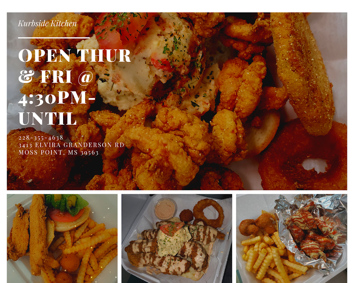 Welcome to Kurbside Kitchen LLC, a hidden gem nestled in Moss Point, MS. With a menu that features delightful open-faced sandwiches of catfish or shrimp, flavorful pork chops, and succulent ribs, this restaurant promises satisfaction. Each dish, priced between $14.00 and $18.00, comes artfully presented with brioche bread, potato salad, a wedge of tomato, hush puppies, and fried green tomatoes.